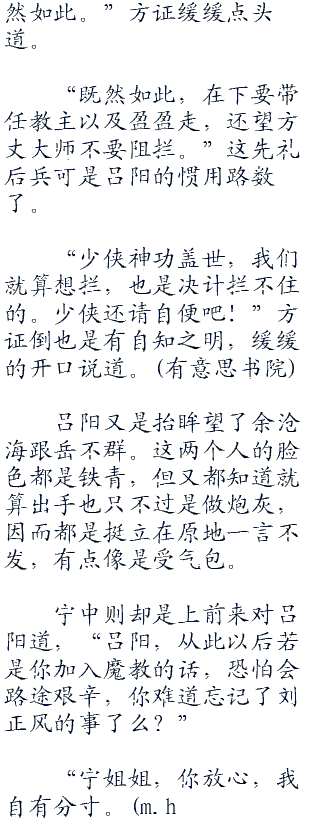 “废话少说!吕阳,我问你,你是不是要帮任我行这个魔头!”吕阳原本还打算跟宁中则叙叙旧,却被左冷禅一声鬼叫给打断了。