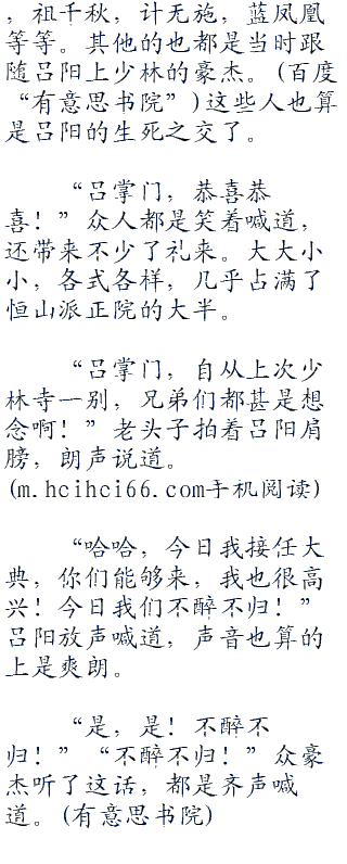 田伯光见吕阳的神色不假,忍不住的大声笑了起来,道,“哈哈,太好了太好了,原来恒山派也不止我一个男人嘛!来,吕兄弟,喝了这壶酒,我们一起到恒山上去!”