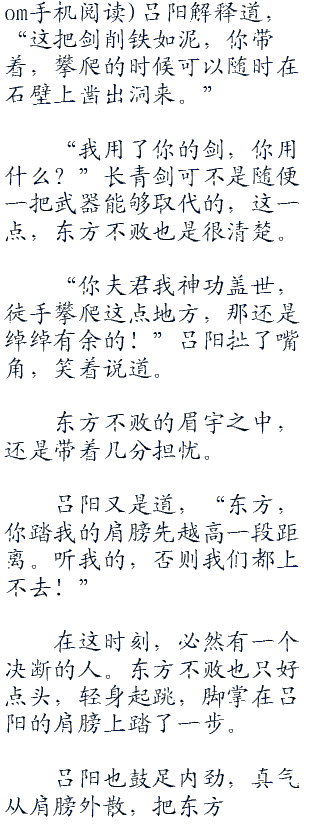 东方不败接了长青剑,面露疑窦。吕阳解释道,“这把剑削铁如泥,你带着,攀爬的时候可以随时在石壁上凿出洞来。”