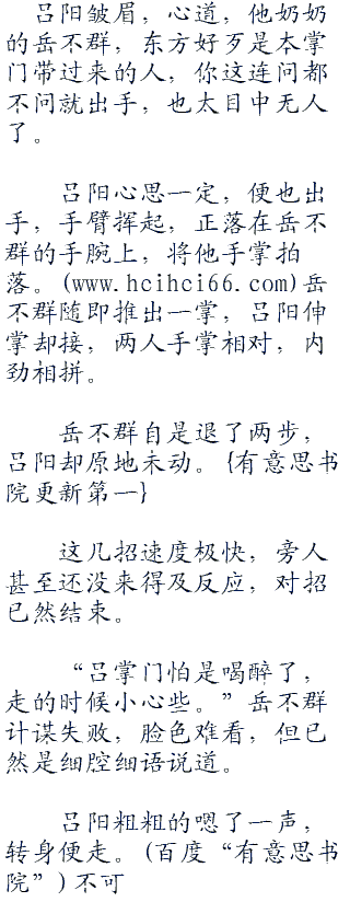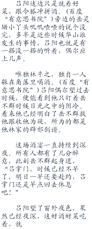 吕阳跟令狐冲拼酒,偶尔听了岳不群这话,也不禁然的皱眉。这老家伙,也太执着了一点。
