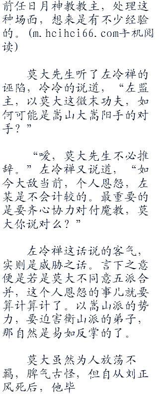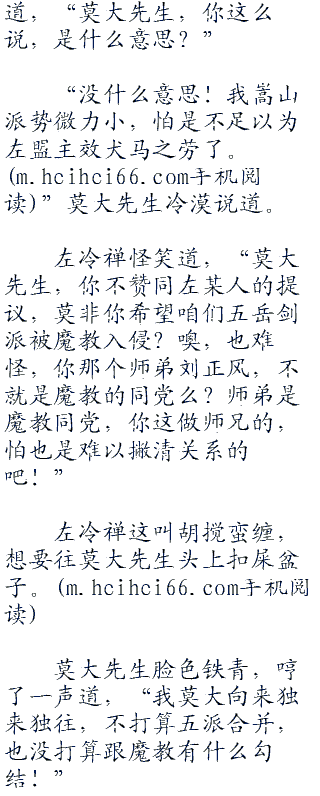 莫大先生脸色铁青,哼了一声道,“我莫大向来独来独往,不打算五派合并,也没打算跟魔教有什么勾结!”