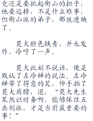 莫大此刻不说话,便是默认了左冷禅的说法。左冷禅带了得意的笑,伸手拍了莫大肩膀,道,“莫大先生果然识时务啊,能够保住五岳剑派,才是当前最重要的事!”