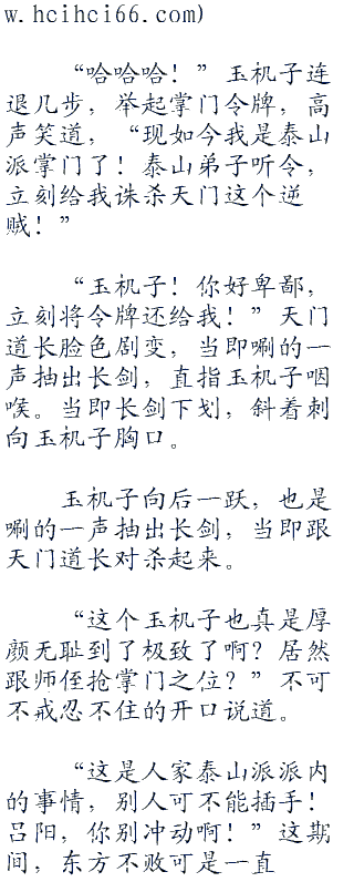 玉机子向后一跃,也是唰的一声抽出长剑,当即跟天门道长对杀起来。