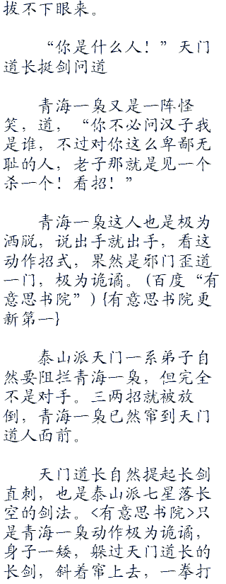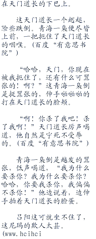 泰山派天门一系弟子自然要阻拦青海一枭,但完全不是对手。三两招就被放倒,青海一枭已然窜到天门道人面前。