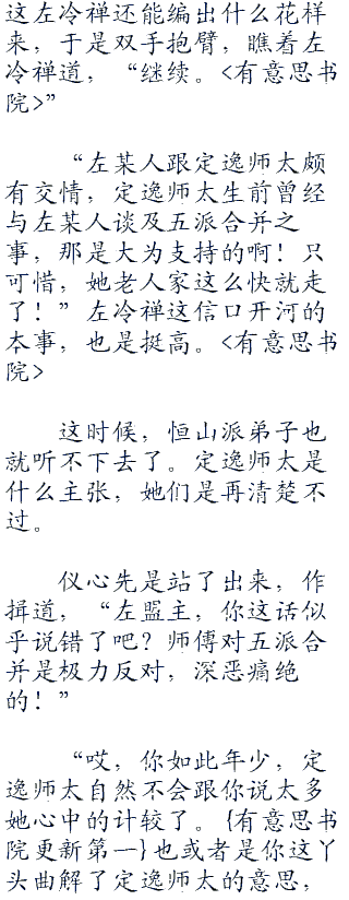 “左某人跟定逸师太颇有交情,定逸师太生前曾经与左某人谈及五派合并之事,那是大为支持的啊!只可惜,她老人家这么快就走了!”左冷禅这信口开河的本事,也是挺高。