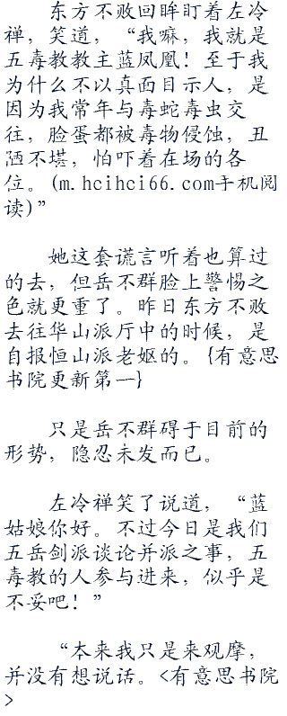 东方不败回眸盯着左冷禅,笑道,“我嘛,我就是五毒教教主蓝凤凰!至于我为什么不以真面目示人,是因为我常年与毒蛇毒虫交往,脸蛋都被毒物侵蚀,丑陋不堪,怕吓着在场的各位。”