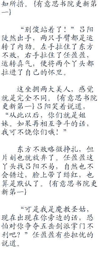 东方不败略微挣扎,但片刻也就放弃了。任盈盈这丫头找吕阳不易,自然也不会错过,脸上带了绯红,也算是默认了。