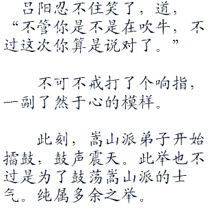 此刻,嵩山派弟子开始擂鼓,鼓声震天。此举也不过是为了鼓荡嵩山派的士气。纯属多余之举。