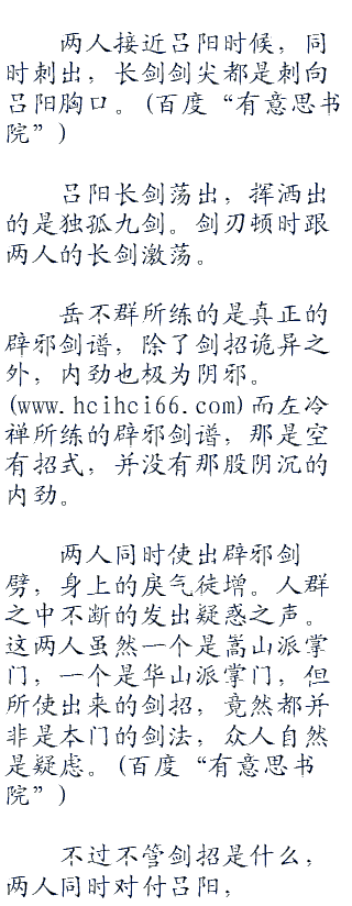 两人同时使出辟邪剑劈,身上的戾气徒增。人群之中不断的发出疑惑之声。这两人虽然一个是嵩山派掌门,一个是华山派掌门,但所使出来的剑招,竟然都并非是本门的剑法,众人自然是疑虑。