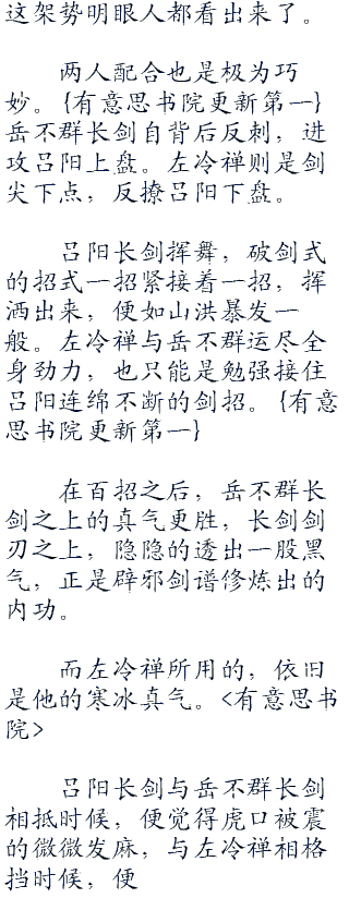 在百招之后,岳不群长剑之上的真气更胜,长剑剑刃之上,隐隐的透出一股黑气,正是辟邪剑谱修炼出的内功。