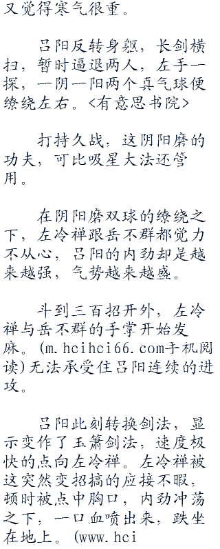吕阳此刻转换剑法,显示变作了玉箫剑法,速度极快的点向左冷禅。左冷禅被这突然变招搞的应接不暇,顿时被点中胸口,内劲冲荡之下,一口血喷出来,跌坐在地上。