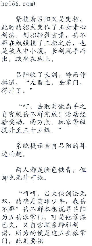 “叮,击败笑傲高手之自宫版岳不群完成!活动经验奖励,两万点。玩家等级提升至三十五级。”
