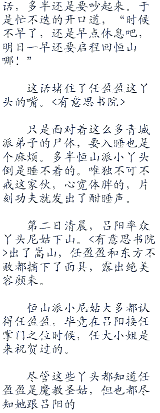 尽管这些丫头都知道任盈盈是魔教圣姑,但也都尽知她跟吕阳的关系,因而也都不语,对她魔教圣姑的身份视而不见。