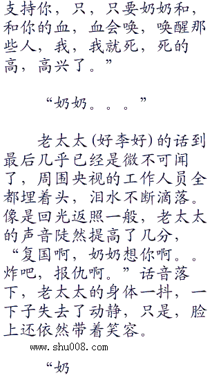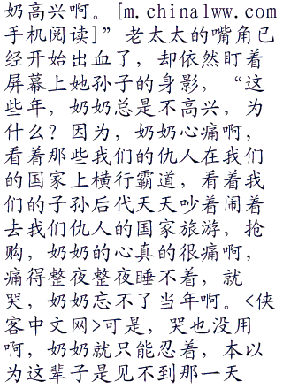 “复国啊,你不是一直都想知道奶奶身上的伤是怎么造成的吗?”屏幕上,老太太的脸上出现了一抹朦胧之色,嘴里喃喃呓语地般说道:“而且,我一直跟你说我们的老家不是首都,你不是问在哪里吗?奶奶不想说,不想去想起,现在,奶奶告诉你,咱们的老家是在南京,你也要记住了,是南京啊。”