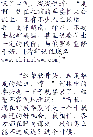 最高首长脸上也露出了苦笑,当今华夏,恐怕也就只有何振中敢这么肆无忌惮地数落那些军委的人了,虽然他是军委主席,但是,说实话,考虑,顾忌的也很多,很多事情也不是想怎么做就怎么做的。