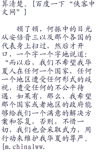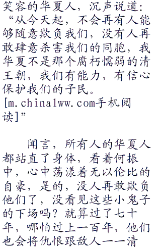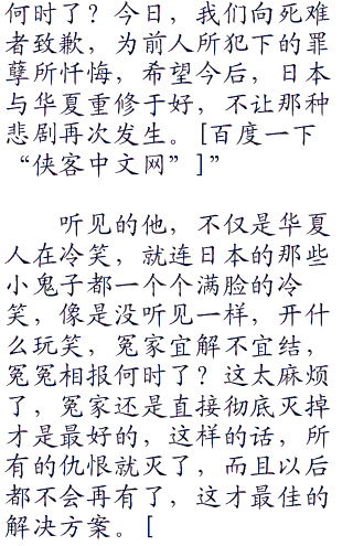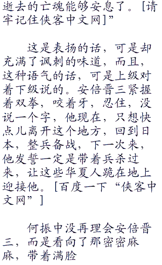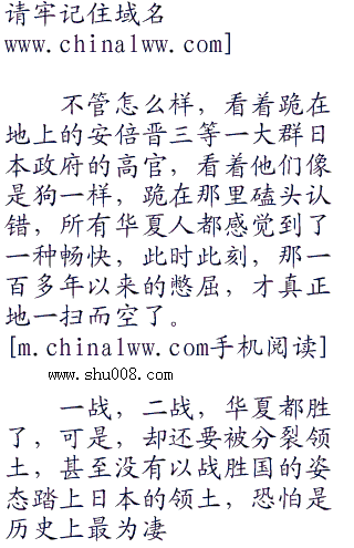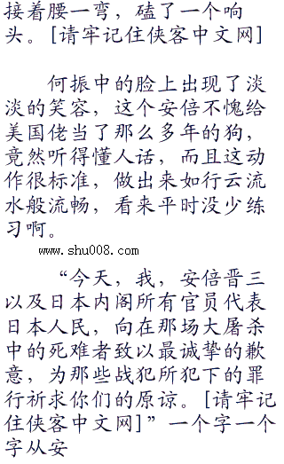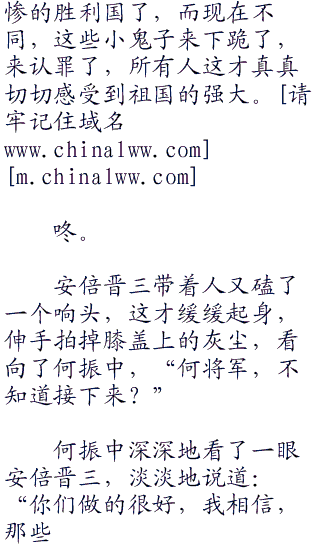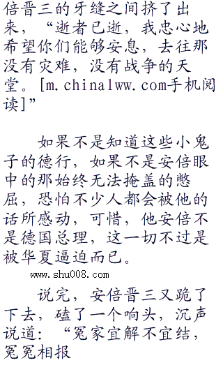 安倍晋三抬头,看向了何振中,因为巨大的耻辱,他的脸已经变得像是僵尸脸一样了,无悲无喜,看起来狰狞恐怖到了极点,他知道何振中想要说什么。他很快移开了头,看向了那面刻着三十万死难者名字的石壁,双手抬起,