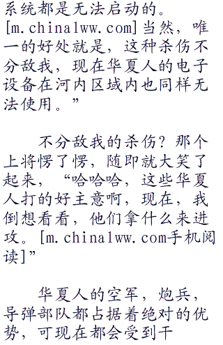“没用的,华夏人应该用的是电磁脉冲弹。”那个家伙眼中满是惊恐之色,身体都在不可遏制地微微抖着,“现在,河内地区所有信号都遭受到了干扰,并且,供电系统,防空指挥系统也都全部完蛋了,现在只怕不少电子元件已经“八二三”遭受破坏了。”