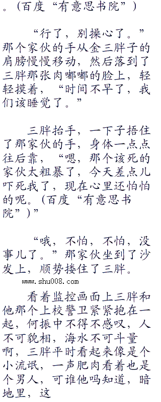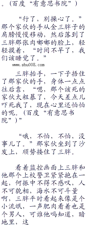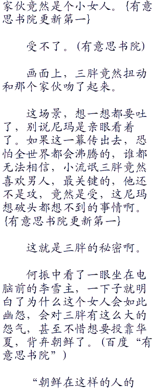 监控画面上,金三胖子穿着短裤,裸着上身,满身的肥肉白花花的一片,他靠在不知道是不是用金线织成的沙发上,嘴里还叼着一根雪茄。.首发