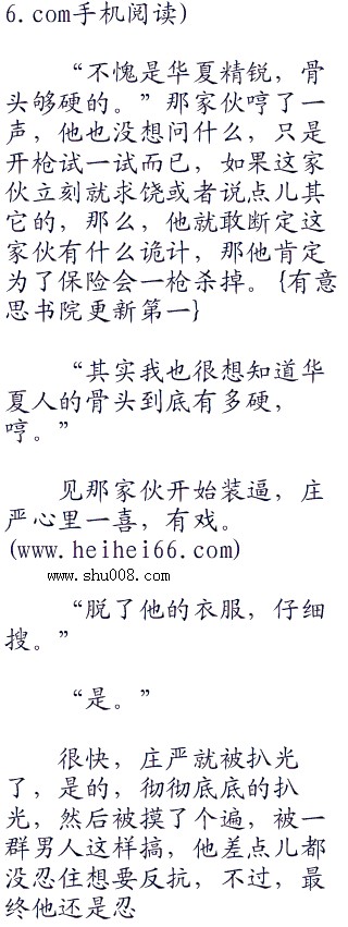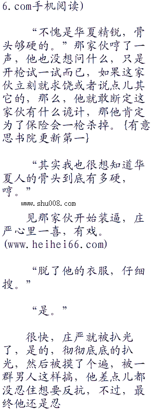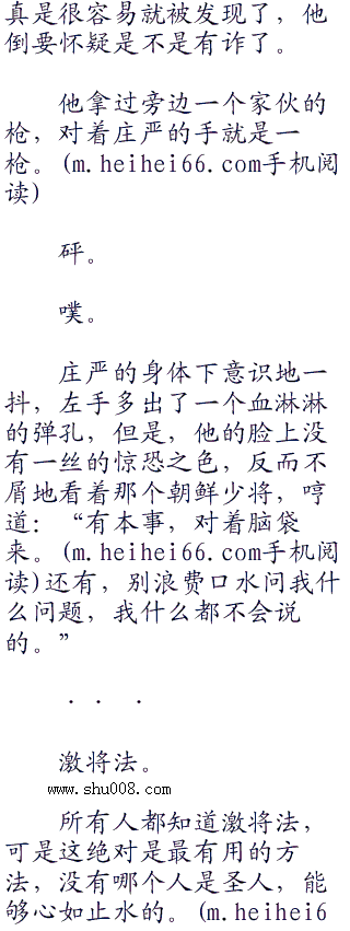 庄严故意慢了那么一点儿,脸上挨了一脚,噗一声,嘴一张,一大口鲜血混着牙齿飞了出去,他也顺势躺在了一边,但是却凶狠地盯着围过来的朝鲜兵。他的情况并不好,至少双手双