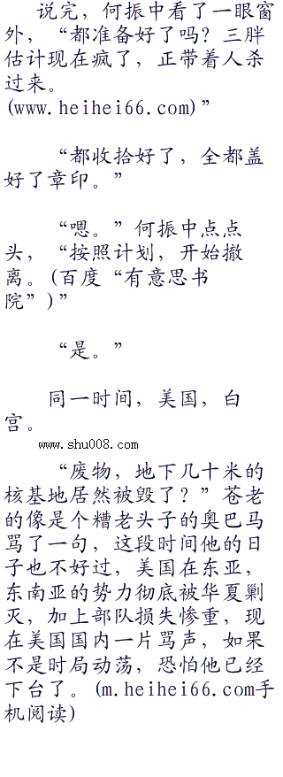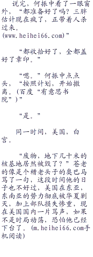 其他的人也都在感叹,说实话,他们心里根本没有抱多大的希望,地下核基地肯定是防线一重又一重,守卫森严,想要毁掉,谈何容易?甚至,他们都在劝何振中离开平壤这个危险的地方,尽早回国,可是何振中却固执地依然要在这里等。