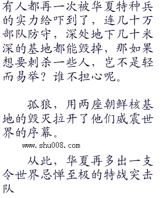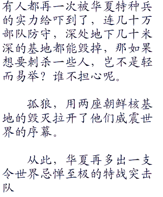 他们知道,又一支顶尖的特战突击队将扬名整个世界,为各**方所忌惮了,深入千里,在几十万朝鲜大军的防守中渗透,成功毁掉地下核基地,这份战斗力足以让所有人都感到心悸了。