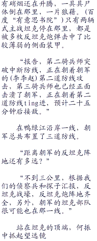 一辆接着一辆的式主战坦克开上了浮桥,快速通行而过,没有丝毫的停顿,直接冲过了一个连的战士把守的桥头堡位置,快速朝着朝军防线ting进。