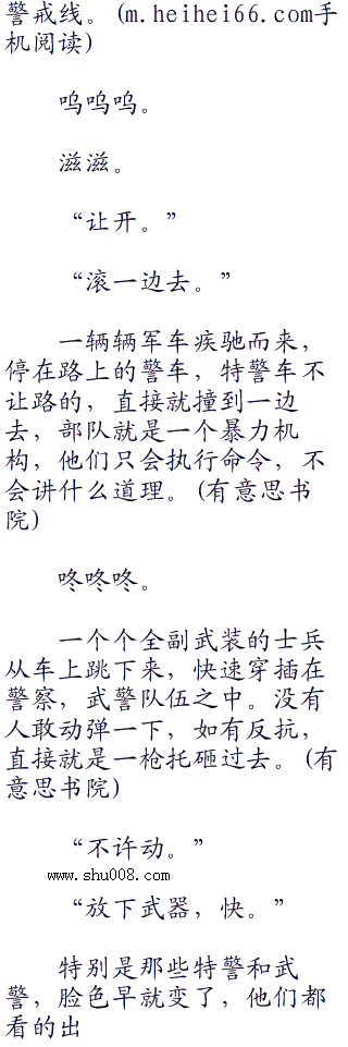 那些武警一个个脸色大变,可是,面对荷枪实弹的野战军,看着地面还在冒着热烟的弹孔,他们忍不住吞了吞口水,在向上级汇报之后,立刻撤走了,他们知道,出大事儿了,而且绝对不是他们能够插手的。杀气腾腾的野战军,头顶上的直升机编队,甚至还出现了战斗机的踪影,这绝对是不可想象的事情。