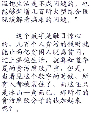 最高首长满脸铁青,一巴掌拍到了会议桌上,“好啊,好啊,真是应了那句话,朱门酒肉臭路有冻死骨,这么多钱,哪儿来的?还有多少老百姓吃不起饭?街边上还有多少人在乞讨?这么多钱,一个普通人要挣多少年?”