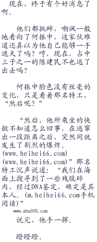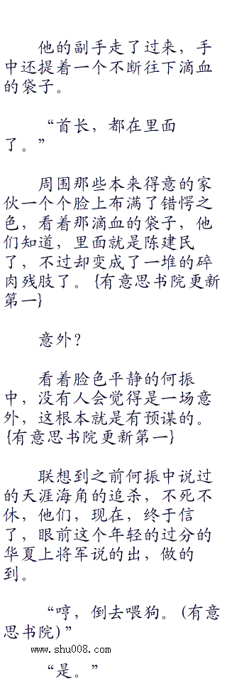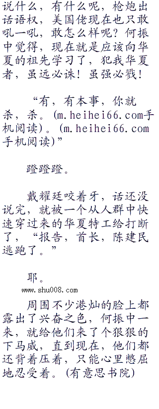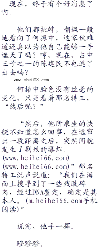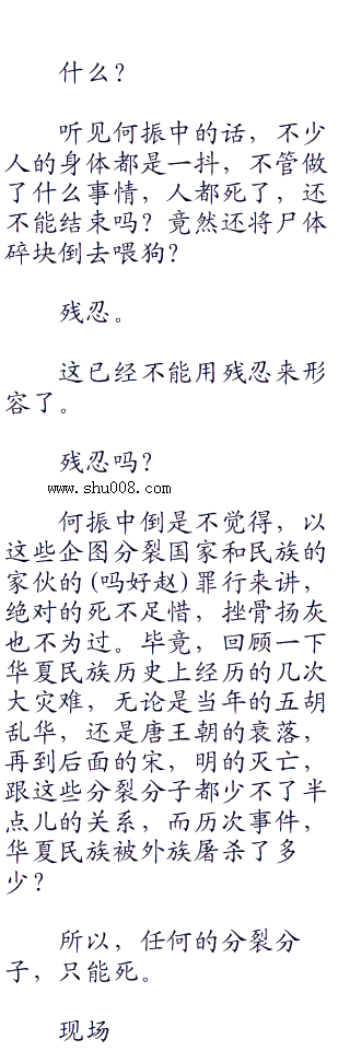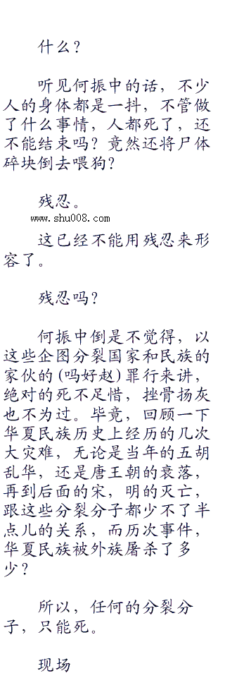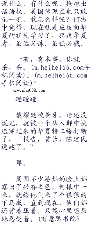 华夏容忍了太多,退让了太多,以至于现在很多人还以为现在的华夏是几年前那个华夏,不敢对他们怎么样了,哼。何振中就是要用鲜血让所有人都知道,现在的华夏,强势,强大,容不得半点儿挑衅。