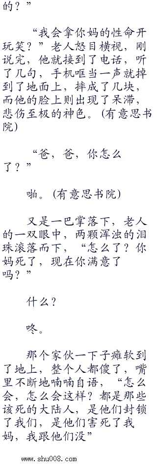 “不低头,不下跪,行,可以,你有本事了,翅膀长硬了,是吧?你有本事了,我可以不管你,但是,你不能不管你妈,现在,你妈就在医院躺着,可是,医院里没有药,你不是很厉害吗?不是要对抗大陆吗?去啊,去找药啊,去救你妈啊。”