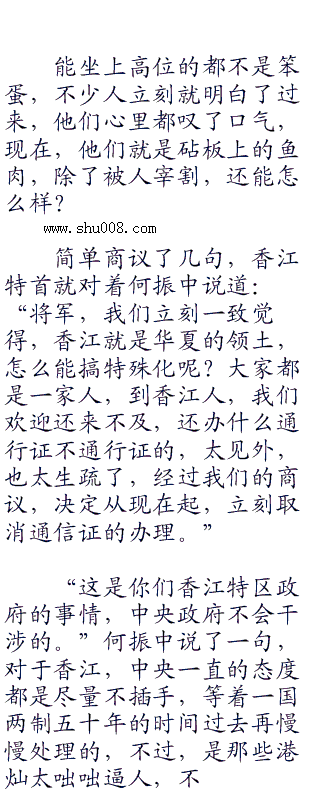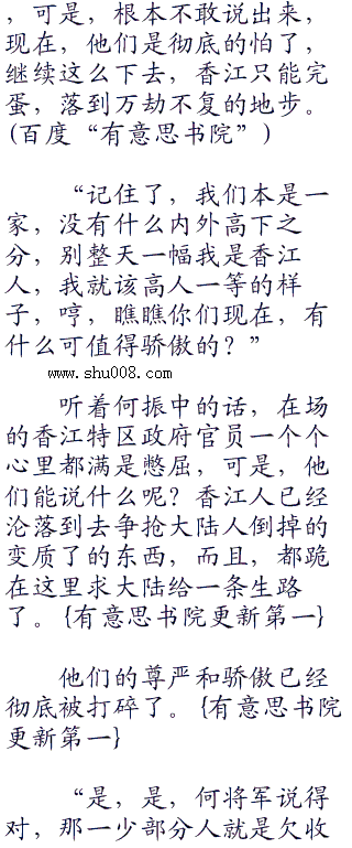 现在,知道香江政府离不开大陆了吗?何振中看着那些家伙,脸色没有丝毫的缓和,有一句话怎么说来着,过了这个村就没这个店了,毫无疑问,以后的香江肯定会摔落的,一国两制维持五十年,还有三十来年的时间,到时候,香江只会沦为一个普通的城市,彻底失去金融中心的地位,无论是上海,深圳还是广州,完全都可以代替。