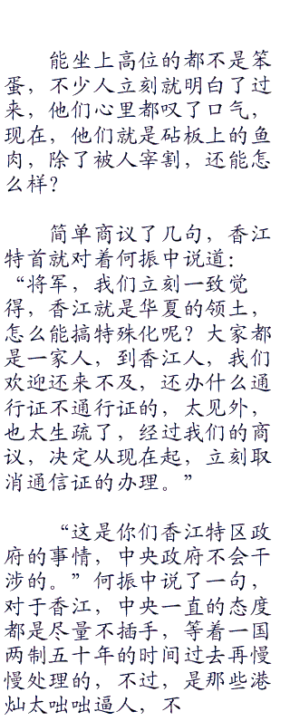 香江特区政府特首来到了何振中的身前,满脸的苍白之色,整个人和前两天比起来,憔悴了太多,只是短短三天的时间,整个香江就发生了天翻地覆的变化,仿佛一夜之间就从繁华衰败了,甚至到了举步维艰的地步。