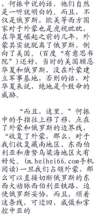 “外蒙古是当年美苏英等国绕开我华夏签订《雅尔塔协定》,之后强行从我华夏之中分割出去的。”华夏最高首长沉声说道:“这是我中华民族历史上最大的耻辱之一,我们是战胜国,但是,却被生生割让了如此之多的领土出去。”