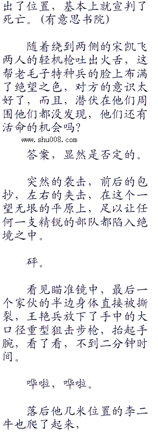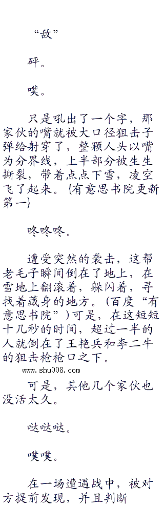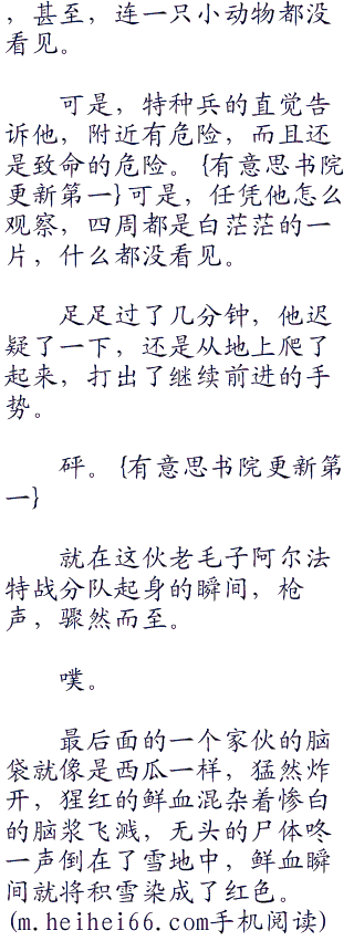 王艳兵轻轻比了个手势,然后就趴在那里,不动了,雪花不断飘落而下,很快就将他们的痕迹彻底给掩盖了,茫茫原野上,似乎除了风和雪花,再也没有别的东西了。