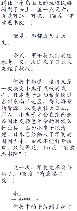 何振中站在共和国号那巨大的甲板上,深思如海,潇洒如风,静静望着眼前波澜不惊的海面,似乎在想着什么。
