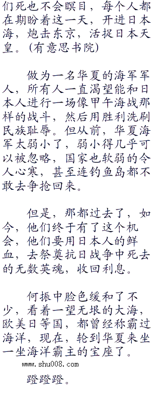 阳光照耀下,四个猩红的大字如此的耀眼,每一个华夏海军军人看见的时候,脸上都会出现一抹兴奋和激动之色,射日,射日,他们总算等到这一天了,要将日本鬼子给通通射死。
