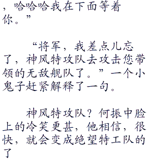何振中在柳小山,邓久光,张冲,鲁炎等食人鲨特攻队精锐的护卫下,登上了大和号航母。