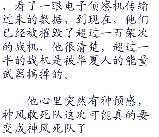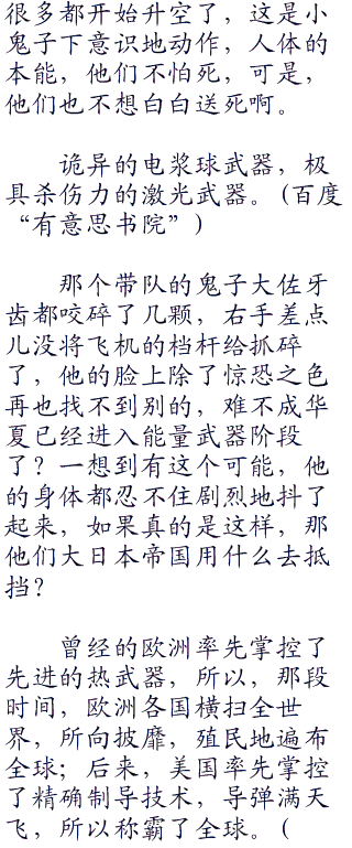 那个鬼子大佐抬头,这一瞬间,时间仿佛静止了一样,爆炸声,纷飞的导弹和防空炮弹都从他的眼中消失了,他的眼中只剩下两条胳膊粗细的蓝色