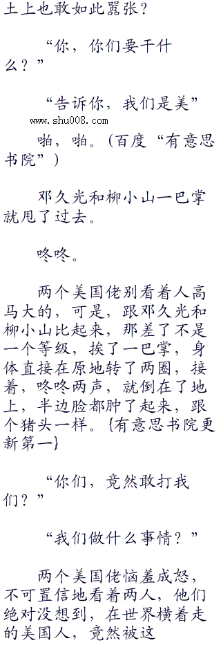 一个美国大兵话还没说完,就只感觉眼前一道黑影闪过,接着就是砰的一声,一股剧痛从脸上传来,他高大的身体咚一声就朝着一边倒了下去,趴在那里,半边脸都肿了,嘴一张,一口鲜血混着牙齿就喷了出来。