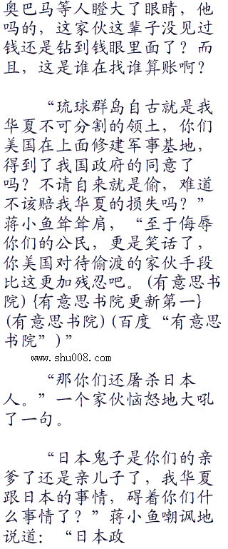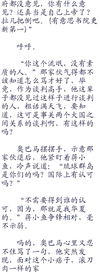 华夏大使馆的会议室中,带着人气势汹汹来兴师问罪的奥巴马真的快忍不住了,心里早就在骂娘了,这些该死的华夏人竟然就把他们晾在这里?草,难道忘了几年前,美国说一,华夏不敢说二的事情了吗?