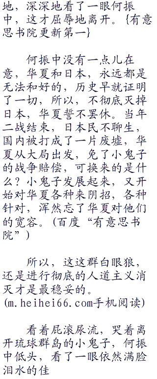 “还站在这里干什么,滚回日本去 .。”对于小鬼子,何振中永远都没有任何的留情,直接骂道:“别站在这里了,脏了我们的眼睛。”