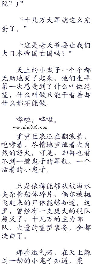 天下的鬼子战机呼啸着,那些小鬼子只能眼睁睁地看着,一艘艘武装渔船,武装货轮倾翻,被海水挤压成碎片,满船的小鬼子没有一个能够幸免。