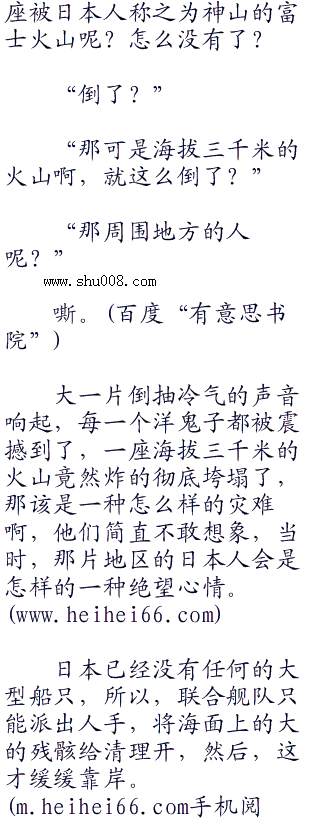 特别是,当他们看到外面被海啸,核弹冲击波破坏的一片狼藉的东京城,再看着那些街上的民众无助,惊恐的身形,这些小鬼子的心一片冰凉。。 ww w ..co m
