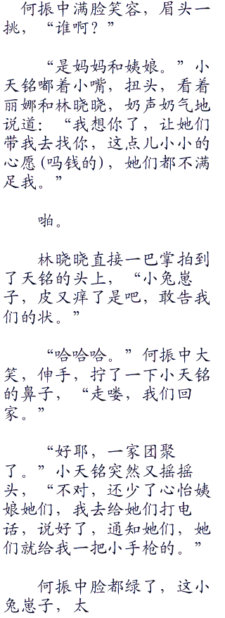 虽然说着,但是,何振中从林晓晓的脸上却没看到任何的责备之色,他心疼地搂住了林晓晓,凑到她的耳边,“吃醋了吗?”