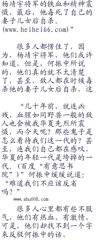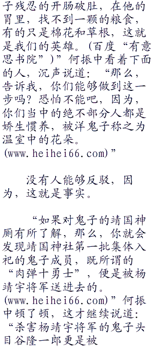 “当小鬼子不断参拜靖国神社,我们愤怒中烧的时候,我们是否想过,凶残的小鬼子尚且以这样的方式去祭奠他们心目中的英雄,可是,我们反而却将自己的民族英雄给遗忘了,这,难道不是一种悲哀吗?”何振中的眼中有一丝痛苦之色闪过。