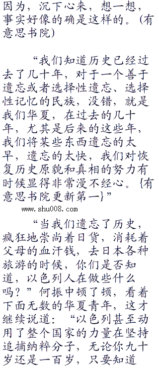 见状,何振中叹了口气,这才缓缓说道:“你们要记住,如果那段血腥的记忆在我们这代人身上出现割裂、扭曲和断层,那么,我们这代人会成为历史的罪人。”