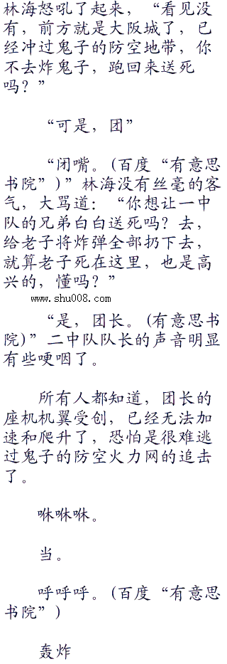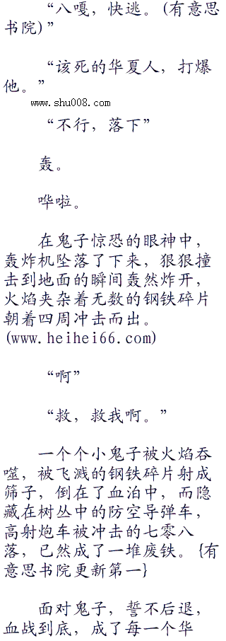 最后的怒吼声响了起来,被击中了尾翼的轰炸机在急速的下坠中生生转了一点儿方向,可依然没有重新飞起来,但是,现在他们的下面,却是鬼子的一个防空阵地所在。
