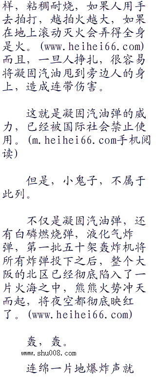 凝固汽油弹在街道上空大概十米的距离炸开,无数的火点朝着四周飞溅落下,沾染到了的小鬼子,立刻就发出了杀猪般的惨叫声,眼睁睁地看着他们的皮肤被烧穿,接着是血肉,直到烧到了骨头,火焰才熄灭。