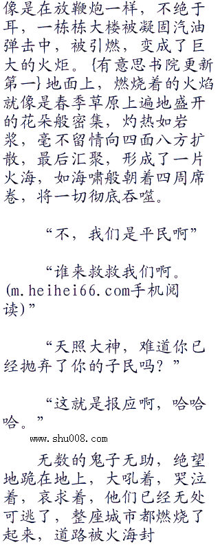 当听见夜空传来的战机呼啸声,当看见一枚枚复仇的燃烧弹从雨点一般,撕裂夜空而下的时候,生存的本能让那些小鬼子发疯了,甚至,有人开着车,拼了命地撞人,企图逃出城去;一些人彻底发疯了,朝着平日里只敢意yin的女人扑了过去。