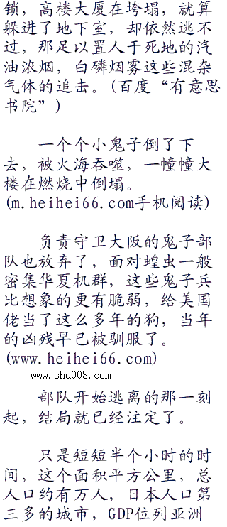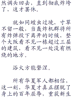 抵达大阪上空,余下的三百架轰炸机快速拉低高度,进入俯冲轨道,带着满腔的怒火和凌冽的杀机,将中华民族百年的耻辱和复仇之心通通灌注到了燃烧弹上,而后,投下。